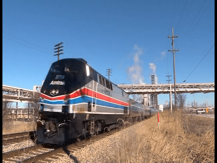 Westbound Amtrak train 303 at the Romoeville Refineries.