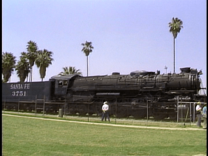 Santa Fe 3751. A 4-8-4 Northern type. Removal from its display setting. Snap track (prototype version) being assembled on the site. Interesting chapter. SP hauls it outbound.