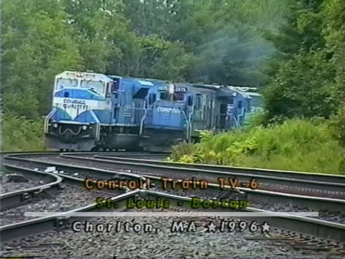 TV6 at Charlton, Massachusetts. Conrail 1975 is a GE B23-7 . The year is 1996. Train is passing an SD90MAC set 4116 on the point.
