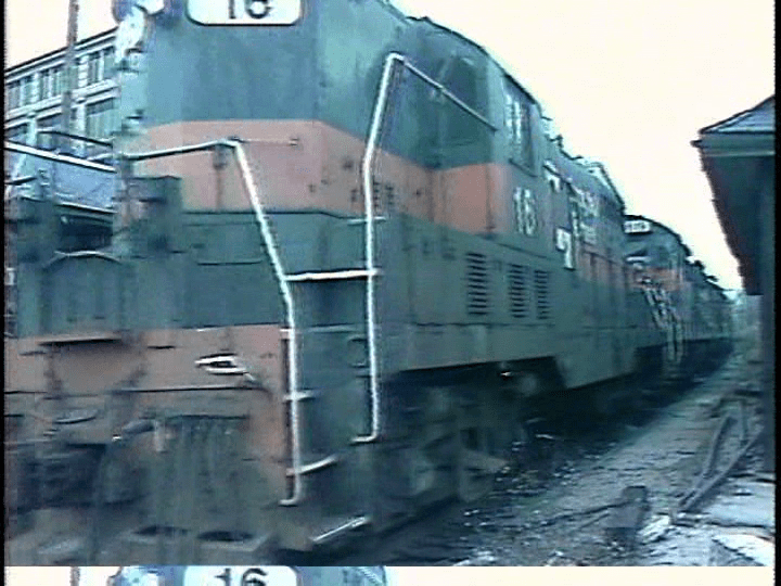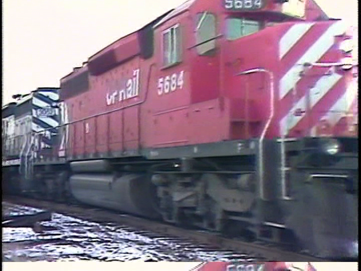 In February 1991, a CP Rail 5684 SD40 leads a coal train at Manchester, NH. Check that sizeable horizontal error bar across the bottom of the screen. Notice the number boards at the bottom of the picture. Annoying!