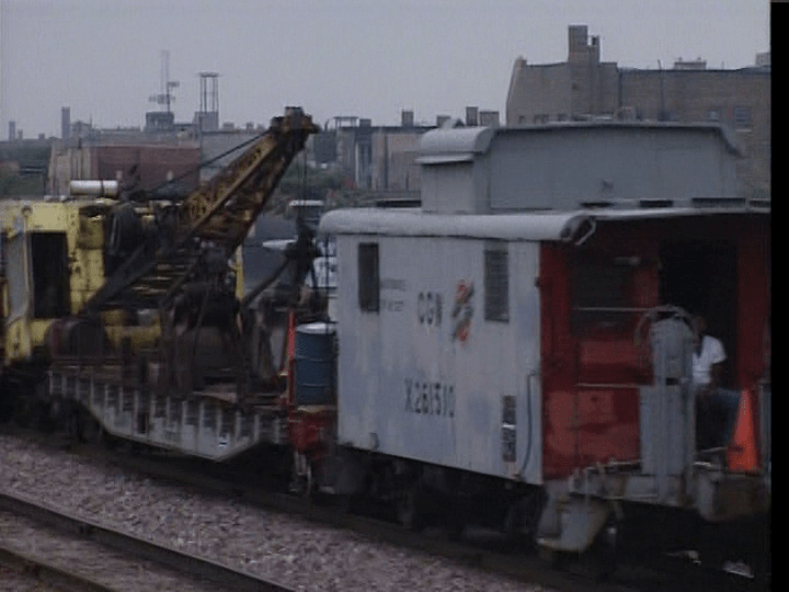 The ex: Chicago Great Western caboose on a Work Train. Viewed from a Metra F40PH on mainline in Chicago.