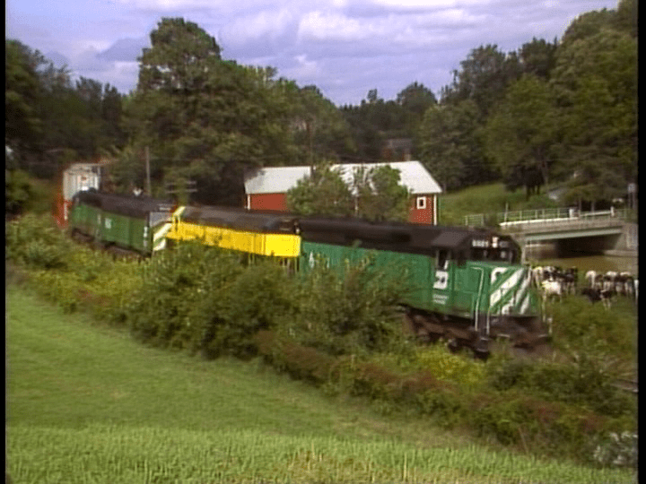 Follow a Sea-Land double-stack over an ex: Erie mainline to Binghamton, NY. BN SD45s lead 6500,63 and a cowl unit.