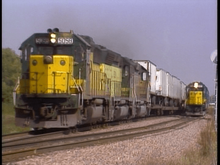 Freights to Fremont, Nebraska. 5063 paced with Conrail 6502, 6376, 6262. A Piggyback with 5058 passes, as 5063 waits.