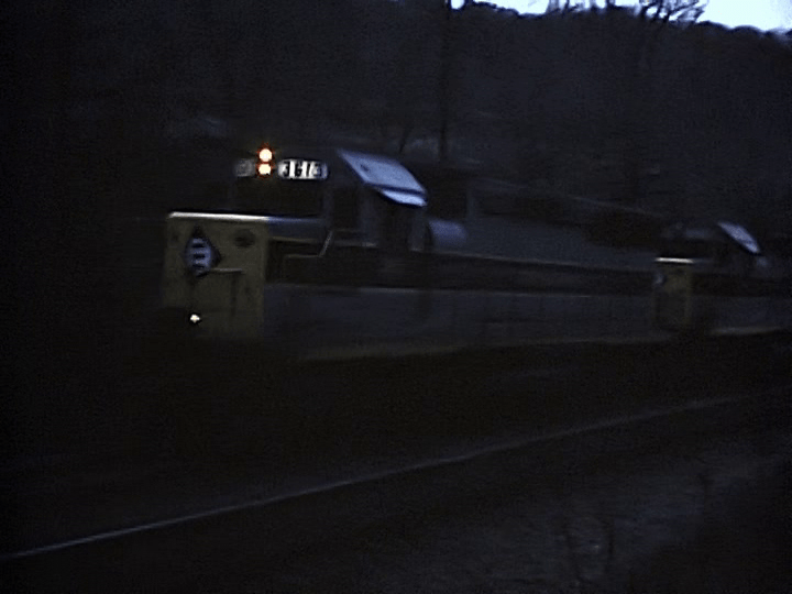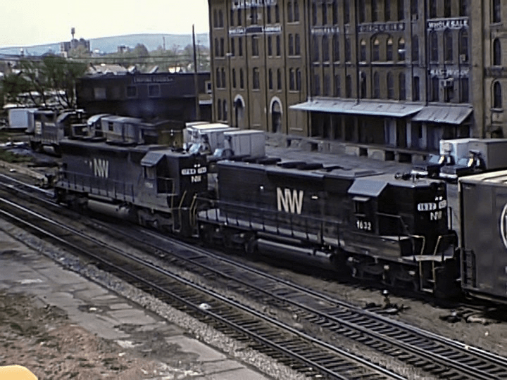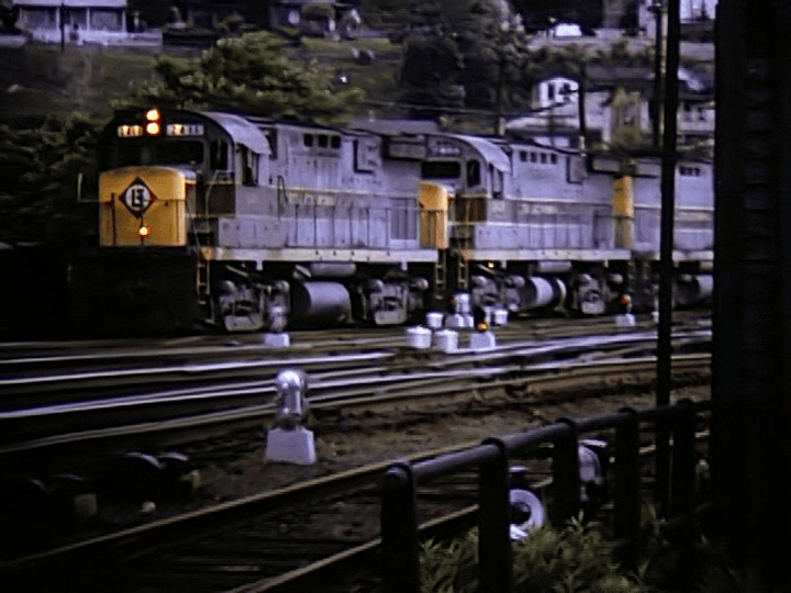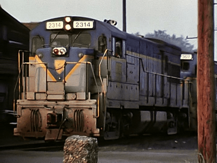DH 2314 leads a freight at Wilkes-Barre. The boxcars sway on the rough trackage.