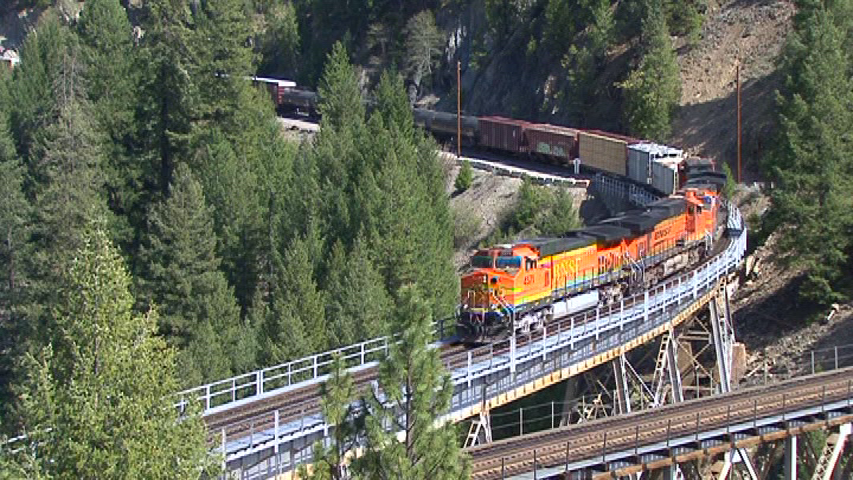 BNSF creeps across Keddie Wye. Several more freights are seen in the vicinity.