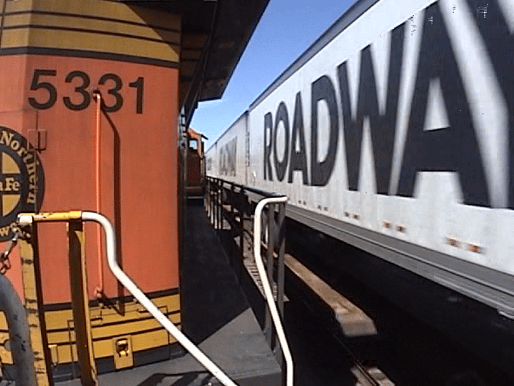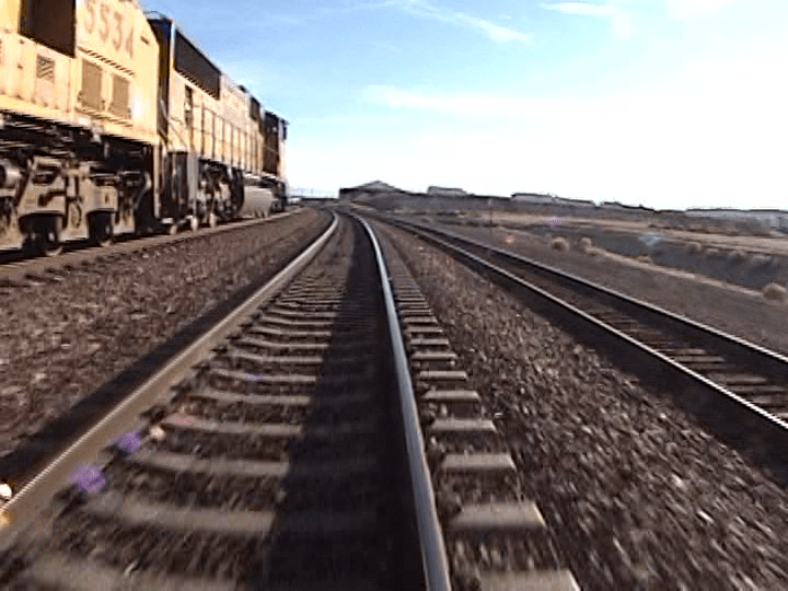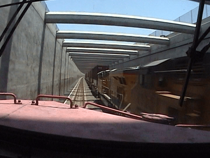 Camera looking from a Hobo viewpoint . The combined TOFC/ COFC speeds past us.
