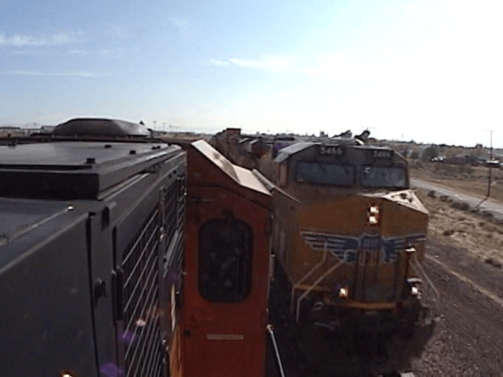 At Victorville. Overtaking a UP freight led by UP 4258 is a solid sequence that lets the show breathe.