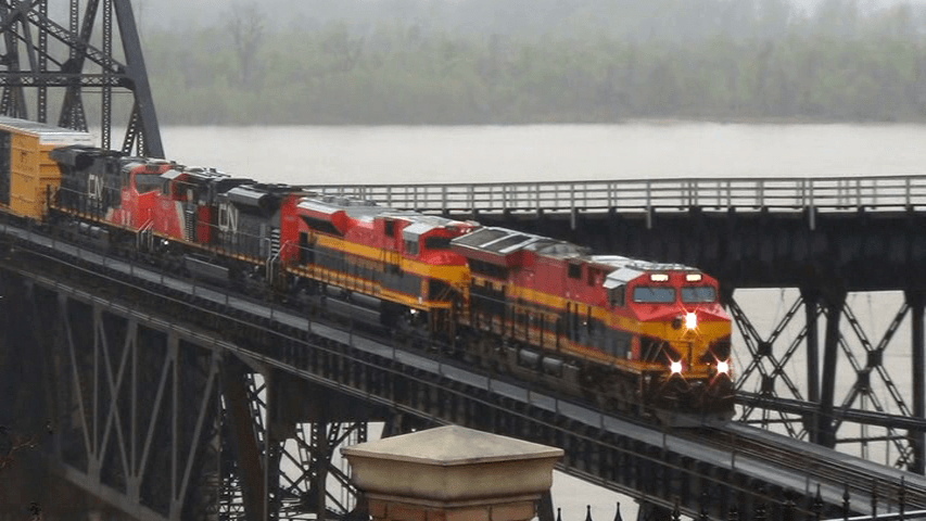 Bridge at Jackson. End of Meridian Sub. Start Vicksburg subdivision. A Sanchez Yard, Mexico to Jackson, Mississippi Train. Joint KCS and Canadian National power this one in a rainstorm.