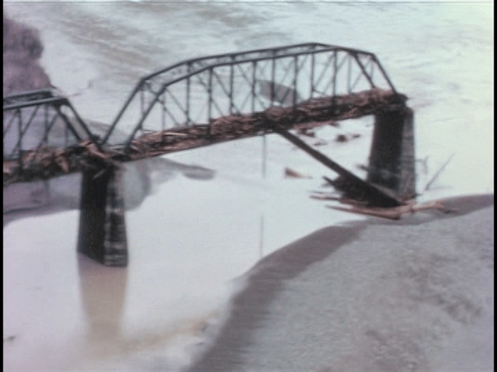 South Fork Bridge is partially destroyed. Note the logs on the surviving spans. Around 100 miles of trackage was damaged. Helicopter tour of the line. A 2nd tour of reconstruction.