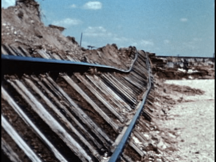 A vintage movie short. Producer was Southern Pacific. Narrated by Taylor Branch. Typical 1950s official railroad movie short. Hurricane Alice damage near Del Rio, Texas. Sunset Limited was stranded. Reconstruction.