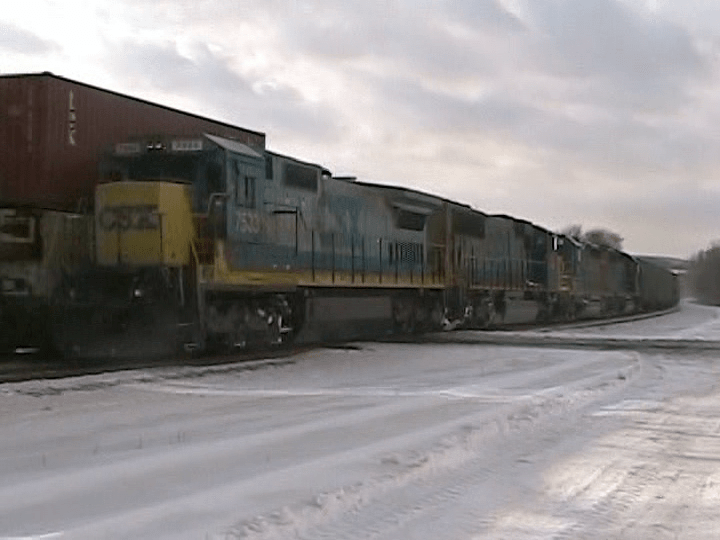 Train G398 meets opposing traffic at Fonda. CSX 7533 on the point. One of numerous freights in snow.