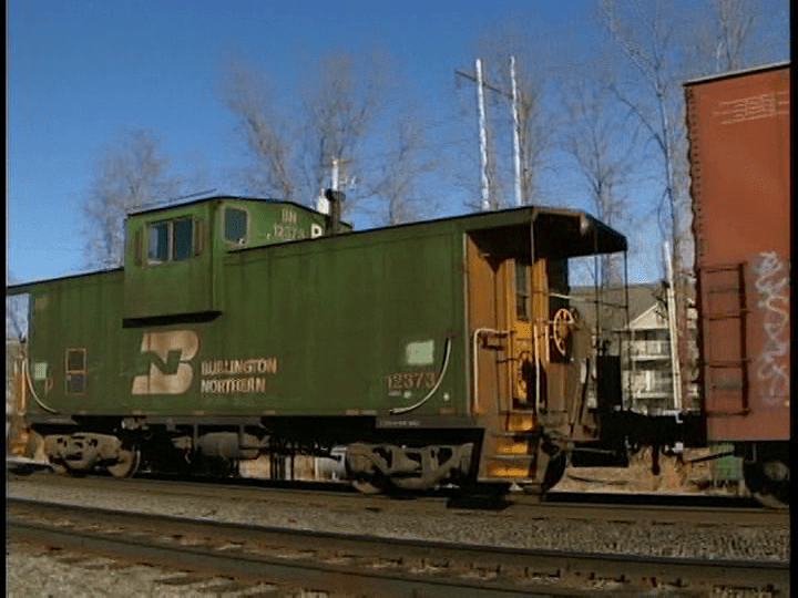 While leased locomotives don’t identify to a specific railroad. Used to be a caboose could. In this instance, a BN caboose on a freight going to Northtown Yard.