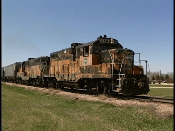 Nobles Rock RR. A GP30 on grain service at Beaver Creek, Minnesota. Speed is 10 mph.