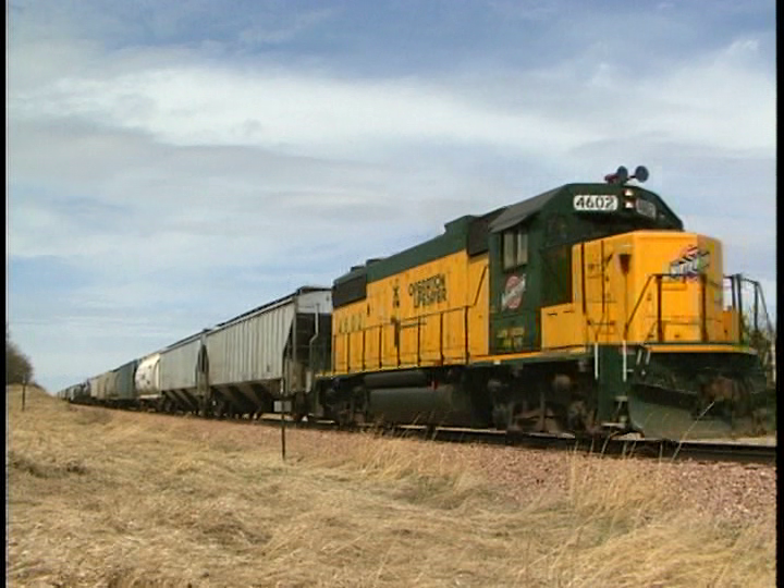 South of Worthington, Minnesota. A train to Bigelow. CNW GP38-2 4602 in Operation Lifesaver scheme.