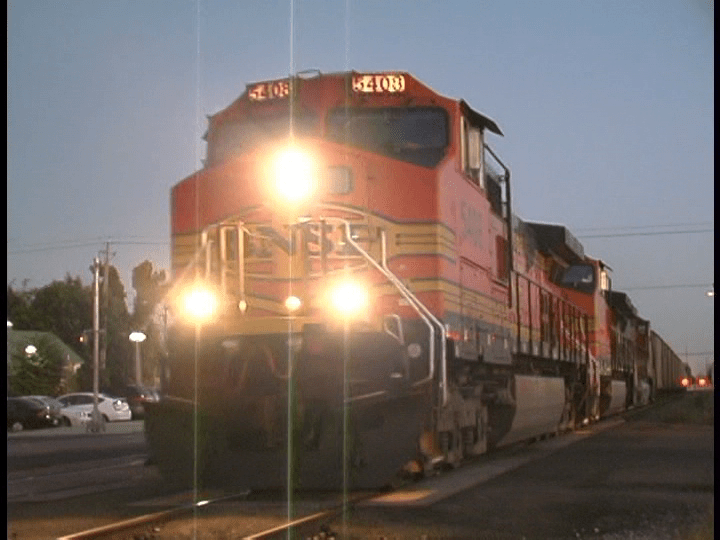 BNSF freight with a 3 unit lash-up. The 5408, 5159 and a Santa Fe Warbonnet is the third motor. This Manifest rolls on Union Pacific rails. Stockton is a busy place with more freights.