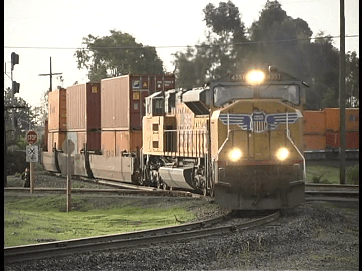 Niles Tower former site is a busy intersection. Union Pacific 4357 winds its way through pulling a container move.