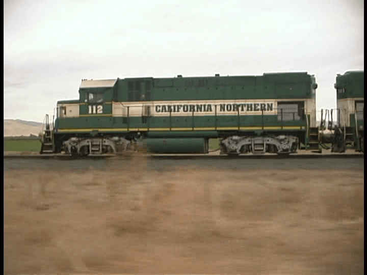 GP15 #112 on a California Northern move with an Eastbound freight is paced near Tracy.