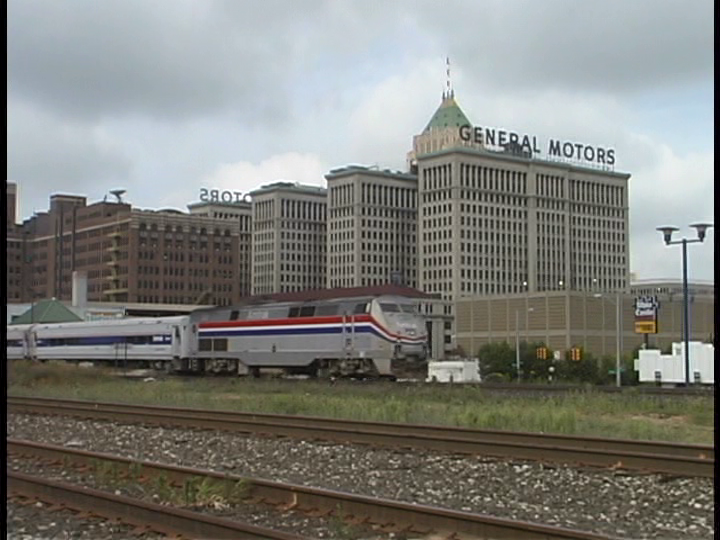 Amtrak Genesis locomotive is on the rear end. General Motors and a White Castle in the background.