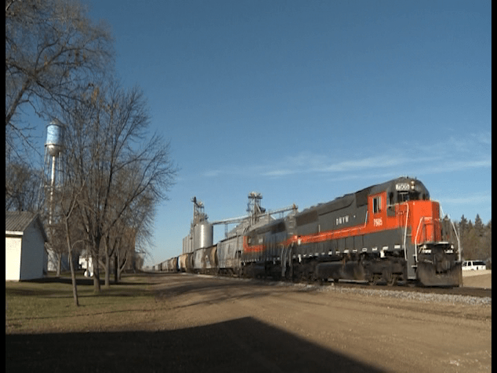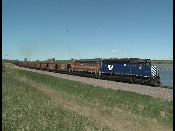 Dakota, Missouri Valley, and Western SD45’s begin a long chapter in North Dakota. A ballast train is East of Pierce. Old Milwaukee Road hoppers are well weathered and sport original numbers. 327 on the head. A former Montana Rail Link engine. Former BNSF line.