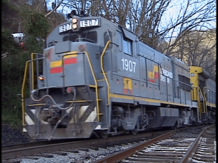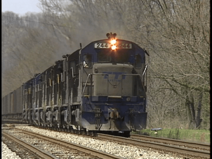 U28B. TTI. Transkentucky Transportation Inc. fostered 18 units. Ohio River Barge Loader to Paris, Kentucky for reload. A load of empties is chased. A loaded coal move from Paris with 6 units is also highlighted.