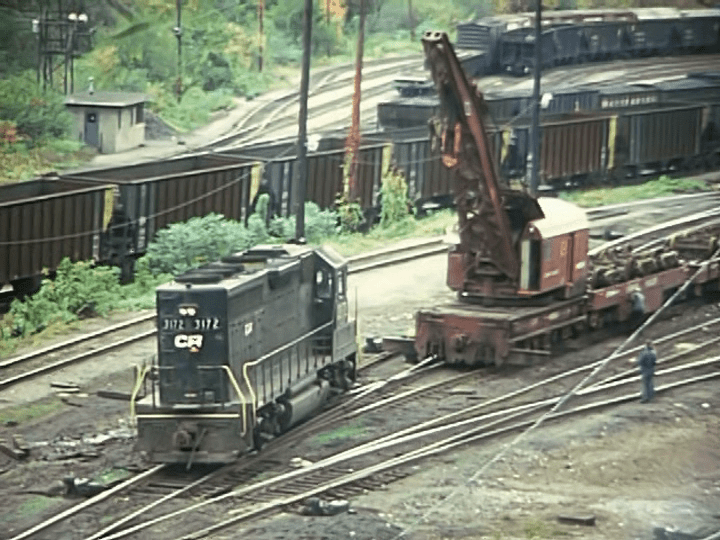 On ex: Lehigh Valley. A former Penn Central GP40 has derailed. The Packerton crane to the rescue.