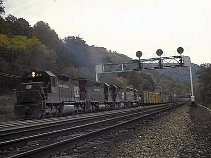 MG Tower. These trains still appear as mostly Penn Central. Impressive lash-ups on Westbound moves with helpers galore. It appears to be much if not all Jonathan Reck filmed at Horseshoe Curve, Scotch Run vicinity.