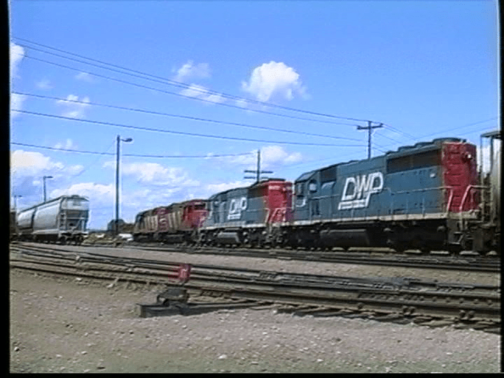 DWP transfer arrives to drop a Potash Train for CNW. Four SD40 units in CN and DWP paint.