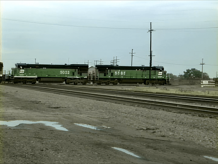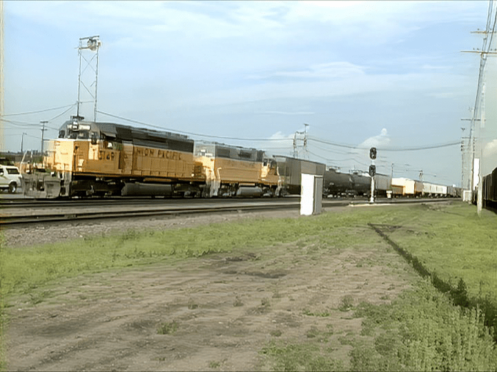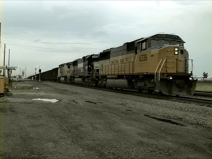 Grand Island sees 100 trains a day at Milepost 146. Wow! This rare footage is before the BN flyover was built. UP 6338, with a Norfolk Southern run-through, clear the BN crossing in Grand Island. Westbound NDYX carries empties.