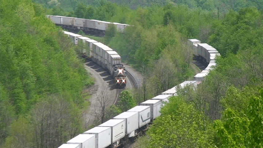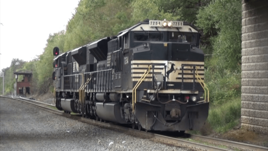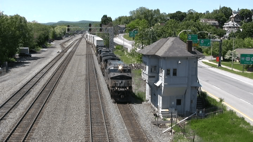 Begins on Norfolk Southern in Altoona, Pennsylvania. DCP was in town for filming, Steam Returns to Horseshoe Curve show. An Eastbound passes the abandoned Alto Tower.