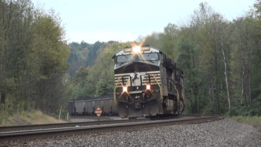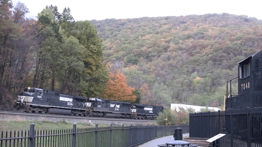 In October 2013. Norfolk Southern action with fall colors. NS 9186 approaches with the display GP9 looking on.