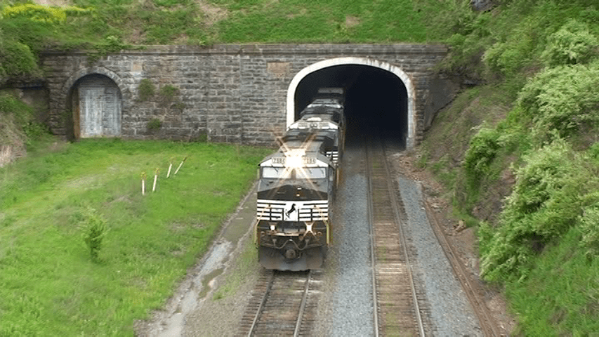 At Gallitzin Tunnel. NS 7584 exits hauling an Intermodal. Note the other tunnel, which is closed. Only one was upgraded for modern trains.