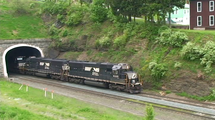 At Gallitzin Tunnel. NS 7584 exits hauling an Intermodal. Note the other tunnel, which is closed. Only one was upgraded for modern trains.