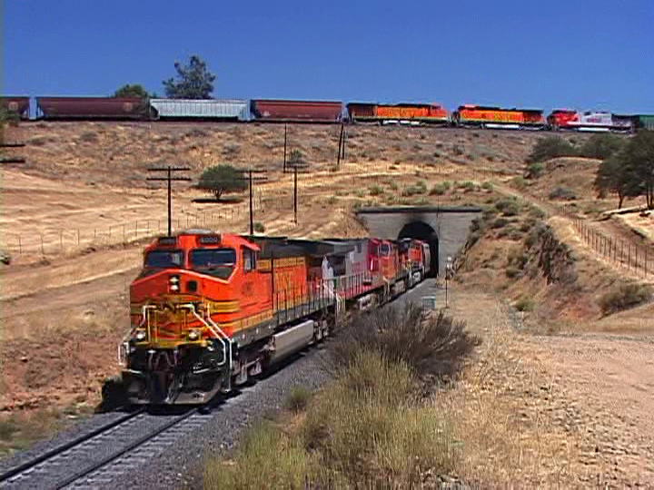 Tunnel 9 at Walong. BNSF 4050 leads a Grain Train. The mid-train DPUs are seen above.