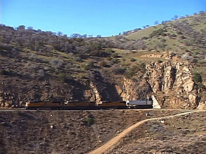 Viewed from above Highway 58. This UP freight travels through tunnels 14 to 17.