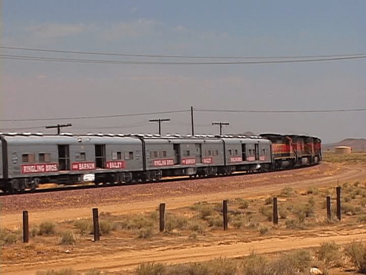 Caliente. A Union Pacific freight rolls past.. There are a couple of dead GE C30-7 units, with three powered SD70m locomotives. The leader is 4582. A BNSF powered Circus Train waits to move.