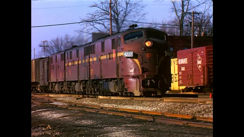Beginning in 1967. This shows the pre-merger railroads. Pennsylvania Railroad. The Manhattan Limited slows at Valparaiso led by E7A 4227.