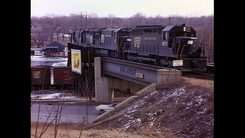 Penn Central livery on all 4 locomotives which are on Ann Arbor/DT&I rails at Ypsalanti, Michigan in 1969. SD 6073 heads this Peabody Coal move.