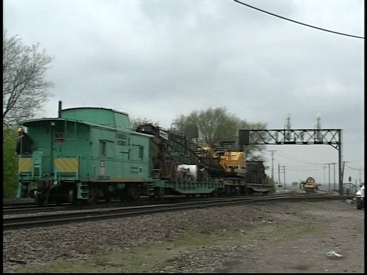 A fine short for model railroaders. Maintenance of Way Crane is motorized with ties and a caboose. On a model, one could power it with something like an SW1500 or a GP9.