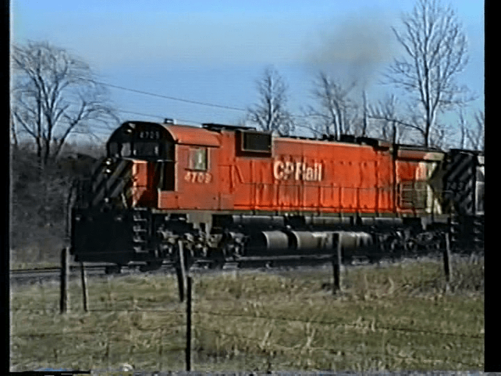 Start at Smith’s Falls, Ontario, on the Canadian Pacific. The Smith’s Falls sub route is to Ottawa. A hotspot for CP Rail and VIA. CP 4709 is on the lead. Stops for a crewman to board. M636 display with an overlay listing locomotive specs. Nice pacing sequence follows.