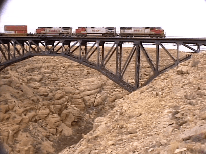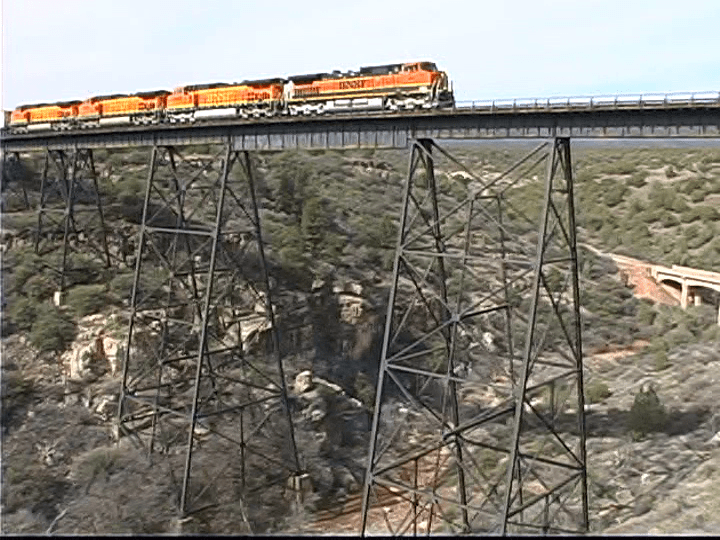 A train goes across a high trestle with an Intermodal at Hell’s Canyon River in Arizona. The Phoenix sub, aka Peavine line, continues through Ash Fork and Williams.