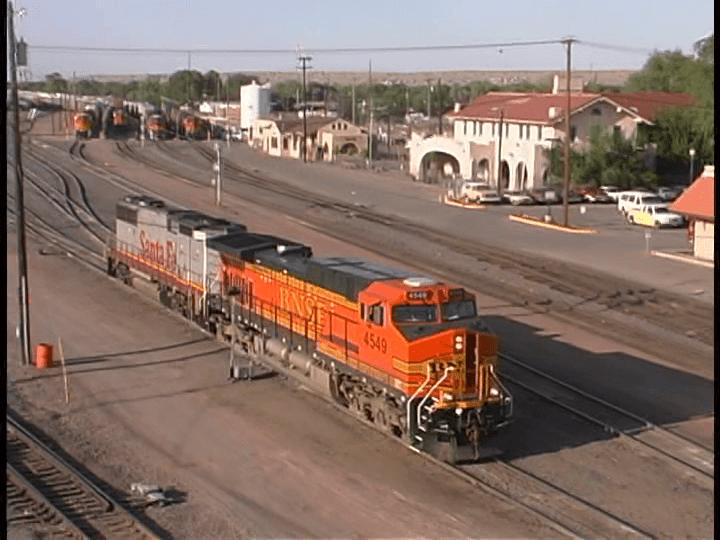 The tour ends at Belen Yard. The depot and former Harvey House are seen here. BNSF 4549 is coupled to a silver B unit. A group of freights stand around. In the script, Rich said, “This was the busiest Santa Fe location that he visited.”