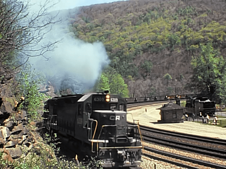 May, 1977. Former Penn Central 6309 smokes it on the upgrade start on Horseshoe Curve. Check the Pennsylvania K-4 steam engine on display. The mostly grouchy narrative continues… Jeez!