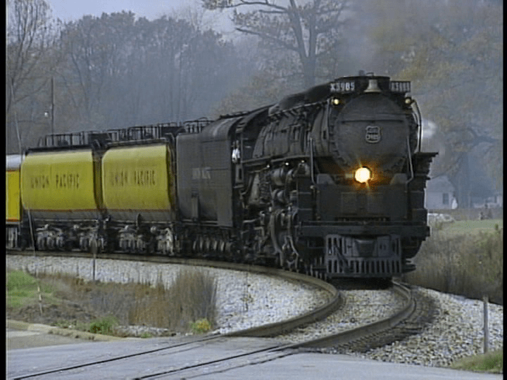 Memphis – Nashville. November 11, 1992. This picks up with the UP 3985 at Memphis. This train journeys to Nashville. On a sharp curve at Mckenzie, Kentucky. The headlight position reveals the articulated design of this locomotive.