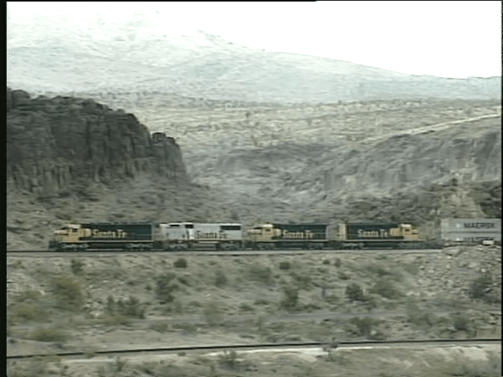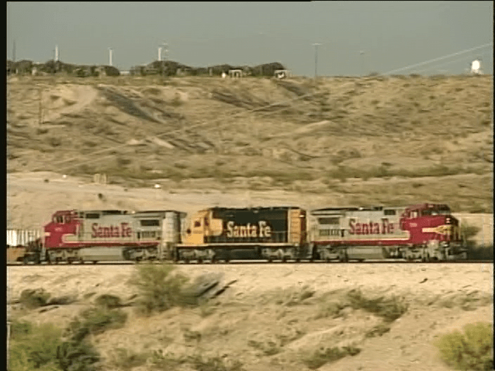 Santa Fe is seen before the merger into BNSF. This earlier video from 1994 showcases the revitalized red and silver Warbonnets. They were truly stunning when first put into modern service. Predecessor blue/ yellow Warbonnets are present. The show title has the obvious focus is Arizona. It is the Transcon line.