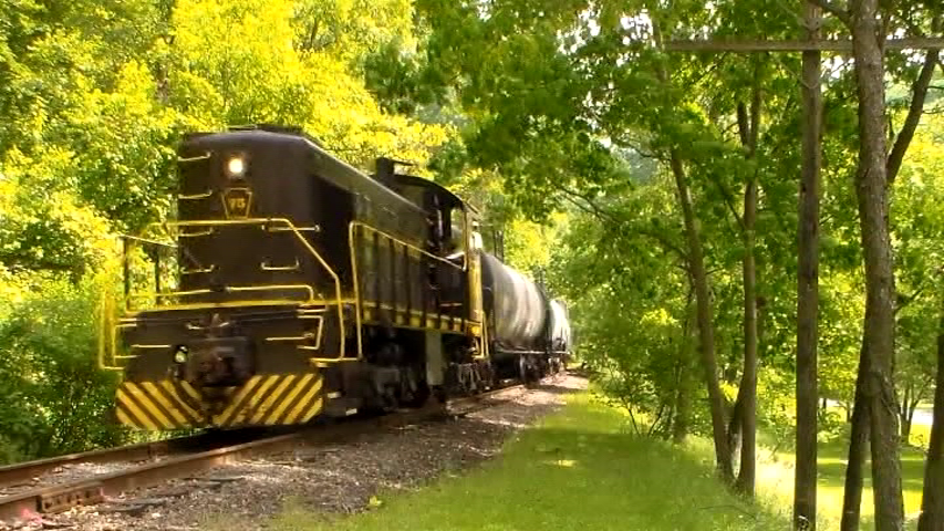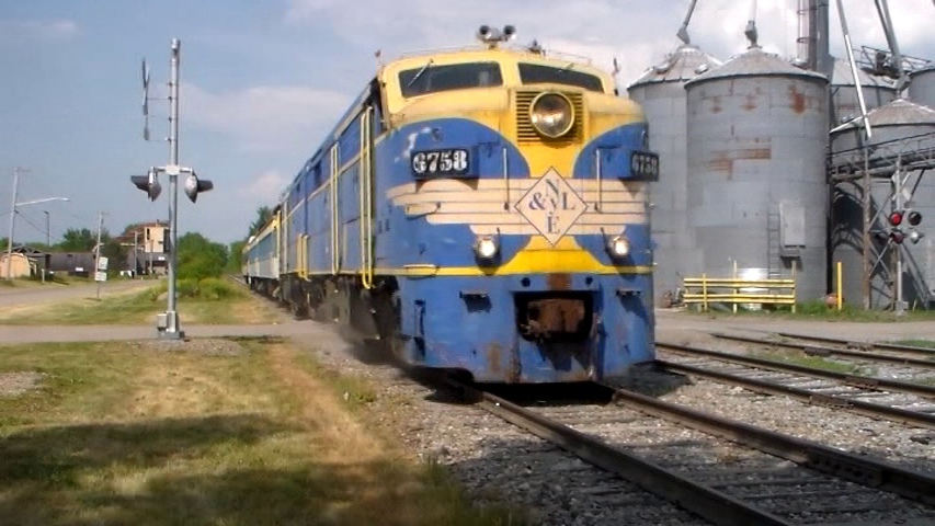New York and Lake Erie. Route is on ex: Erie tracks. Formed in 1978. South Gowanda scene. A mystery pair of Alco FPA diesels. It runs to Dayton, New York. There is no background on the Alco locomotives. The majority is filmed by crossing bells or has a locomotive bell sounding. This segment is ringing my ears almost endlessly. Unedited wind noise, as well. Amateur beginning.