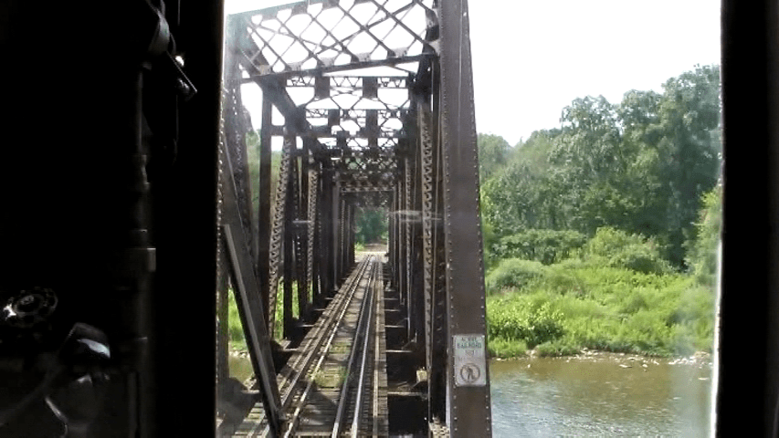 Cab ride footage. Switches to a lame, repetitive musical background, and the narrative has dropped out. Rough camera shake. Could have interviewed the crew. Locomotive and/ or operation description. A random bridge with zero information. It is a much too long segment that is amateur hour. This needs a chapter skip here or deletion. Let me out!!