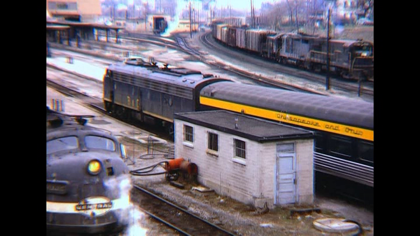 New York Central livery is still seen on Penn Central E units. Baltimore and Ohio diesel powers Chesapeake and Ohio George Washington, which is departing the station. Meanwhile, a Penn Central freight eases by in the background. Toledo, 1970.