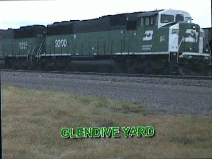 Yellowstone Division. Starts at Glendive, Montana. BN 9200 fronts an Eastbound Coal train in the yard. This is a former Northern Pacific route.
