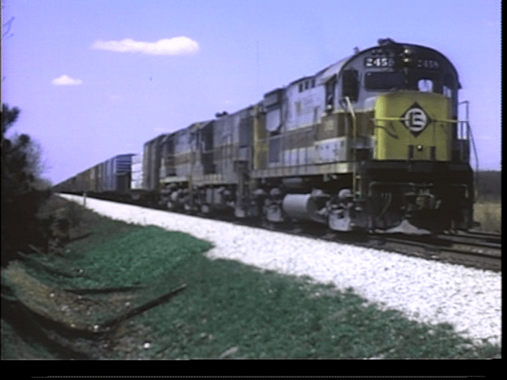 Erie Lackawanna Alcos led by 2458 (in early gray scheme) stop and meet an EL SD45 pair on an opposing train. Surprising amount of EL traffic at Griffith A bunch of various EL locomotives are shown here. EJ&E with unimaginative, plain orange paint travels their own rails, as well.