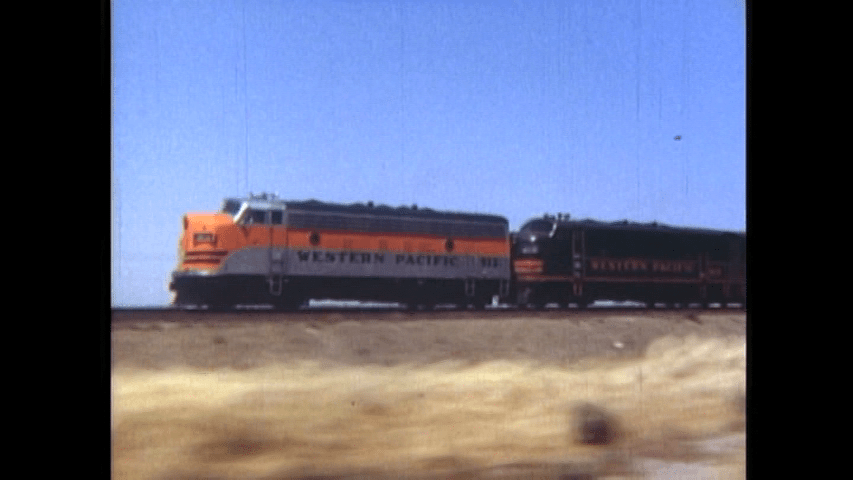 Western Pacific is first. Repainted 913 leads the 3 other F units operating here. The 913 was the only F7 repainted in orange and silver.